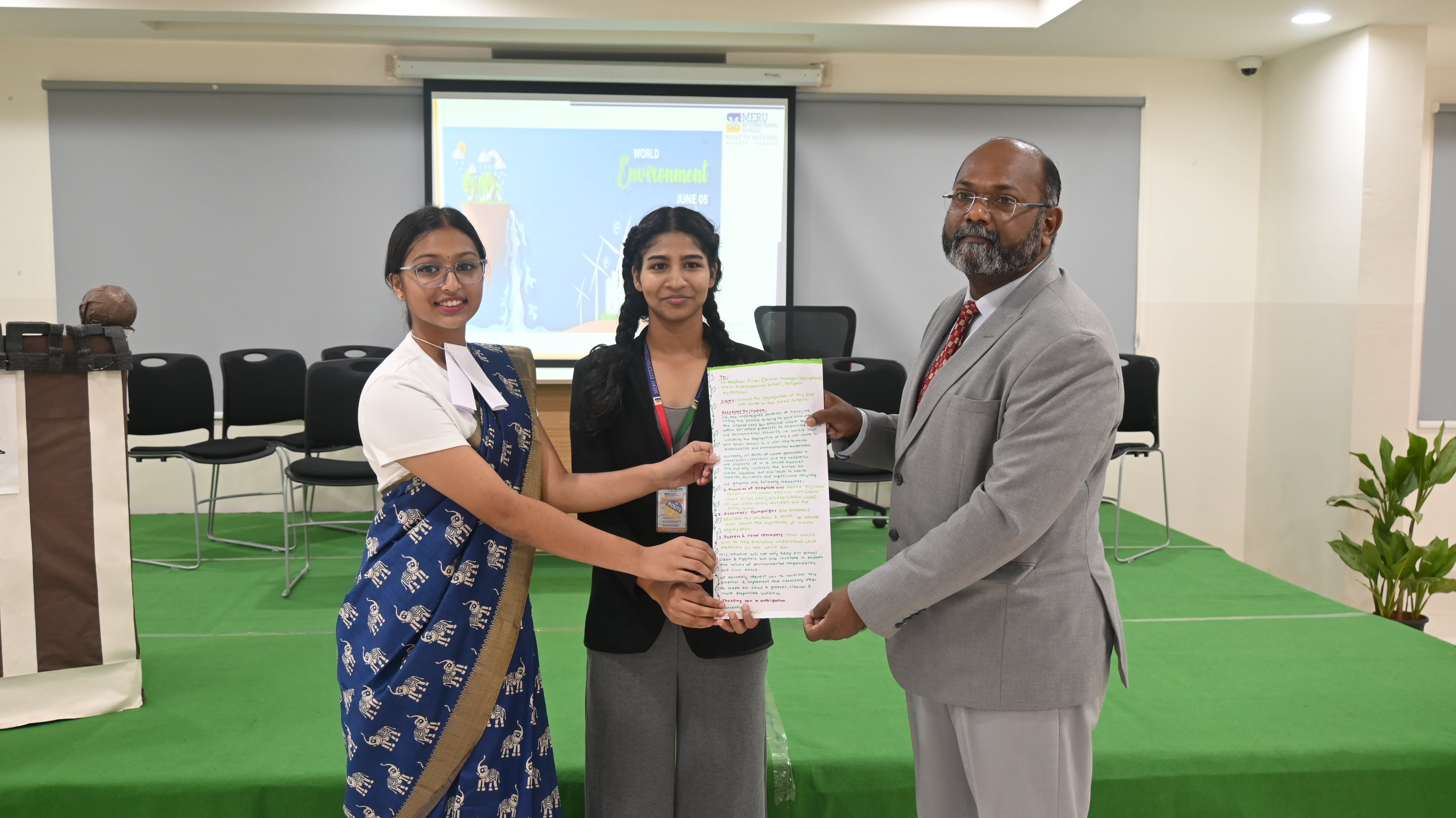 Meru International School observed World Environment Day with a unique and engaging courtroom-style session that brought environmental issues to the forefront. Students stepped into the roles of lawyers, witnesses, and judges to debate real-world climate challenges—bringing the urgency of environmental responsibility to life in an interactive format.